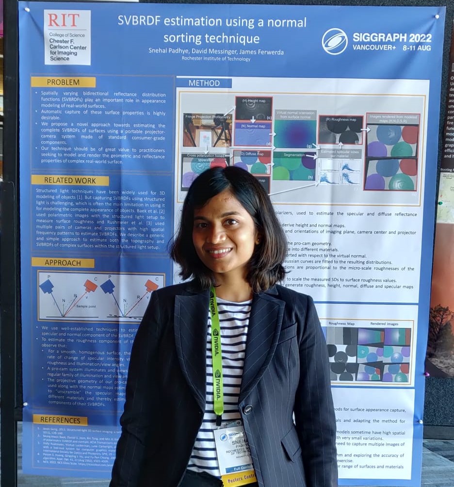 I am a fifth year PhD student at Chester F Carlson Center for Imaging Science at Rochester Institute of Technology, New York. I am priviledged to have Dr. James Ferwerda as my advisor. I am working in Visual Imaging and Technology Lab in developing methods for realistic digital representation of cultural heritage objects. It involves techniques to capture and model surface topography and material reflectance/transmission of complex planar objects like paintings and manuscripts and rendering them correctly(realistically) across devices especially Tangible imaging display systems. This has given me an opportunity to work on topics as diverse as camera calibration, color calibration, structured light profilometry and writing cool graphics applications.